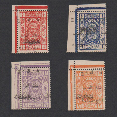 The stamps are part of a set of four stamps from the Hejaz region of Saudi Arabia, issued in 1924. The stamps feature a double overprint and are described as being in “Mint” condition, with a grading of “Very Fine-MNH” (mint never hinged). The stamps are considered “Ex. Rare,” which likely means that they are highly sought after by collectors due to their scarcity.